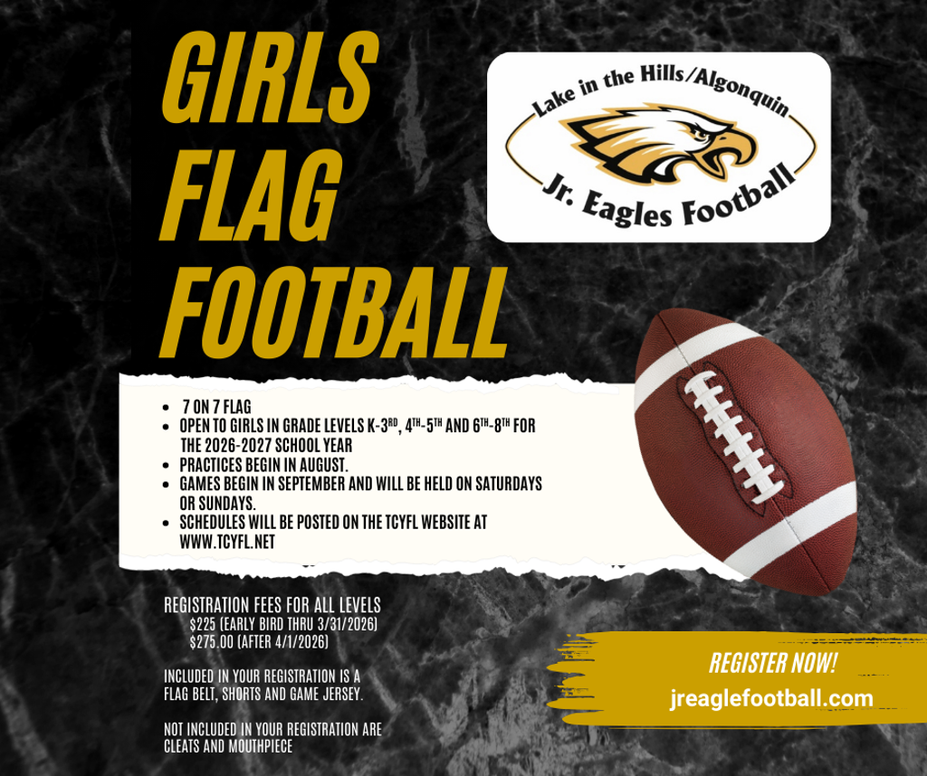For the past 41 years the Lake in the Hills/Algonquin Jr Eagles Youth Football Program has provided a great youth football program for boys and girls in our community. The Lake in the Hills/Algonquin Jr Eagles Youth Football Program provides an opportunity for kids from 5-14 years old to participate in flag or tackle football. The players are grouped by age and weight (for tackle) as well as by skill level (for tackle) to ensure the opportunity for kids of like development to play with and against each other to avoid discouragement while allowing for growth.